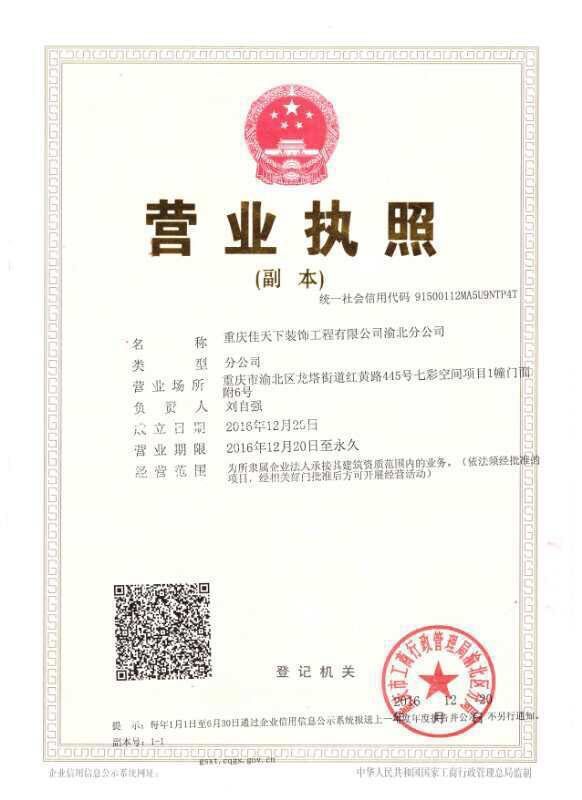 重慶佳天下裝飾工程有限公司,成立于2003年,是一家集設(shè)計、預(yù)算、施工、材料于一體的專業(yè)化裝飾公司,擁有國家二級資質(zhì)。
