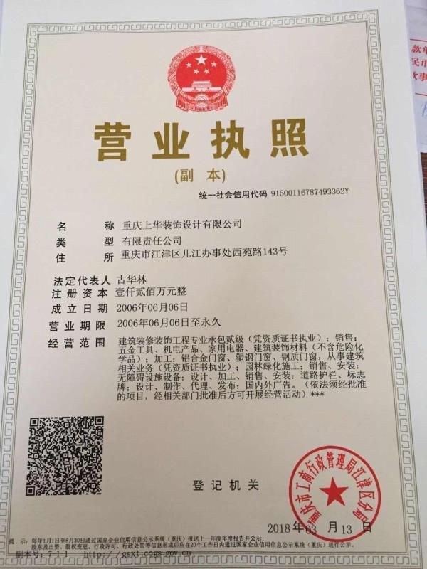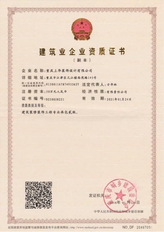 重慶上華裝飾設計有限公司創建于2006年6月,歷經10多年的風雨坎坷、開拓創新,現已發展成為一家集公共工程和家居裝飾、設計施工為一體的國家貳級資質企業。具有建筑裝修裝飾工程專業承包貳級資質。