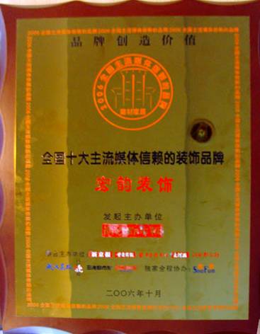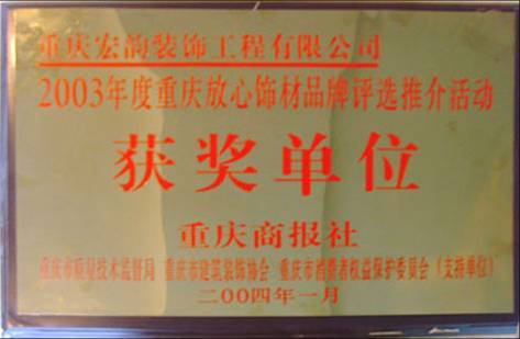 公司自成立以來,不斷銳意進取、開拓創新,以其深厚的文化底蘊和“誠信為本、誠信興業”的管理理念,創造了許多精品工程。先后榮獲重慶市2005年行業飆榜年度總決選“最具人氣裝飾企業”、2005年放心家裝消費“公眾的選擇最受歡迎裝飾企業”、“環保節約型家裝示范企業”、“連續6年零投訴企業”、“重慶市2008年消費者最喜愛裝飾企業”、“重慶市2008年最具號召力裝飾企業”等榮譽稱號。 一個優秀的企業,總是不斷改革,不斷的創新,始終走在行業的前沿。宏韻裝飾一貫堅持“深化改革求發展”的經營思路,敏銳捕捉市場最新信息,把握細節,勇于創新,提出許多新的經營模式,贏得了業界及廣大消費者的高度認可。