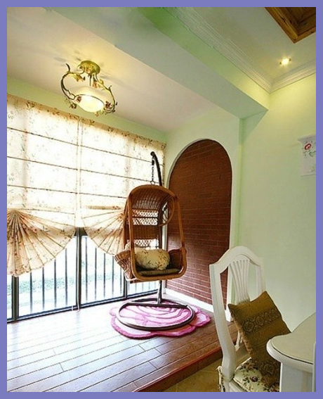 【趣味秋千椅】家里有個秋千是很多朋友童年的愿望,現在就到實現的時候了!內陽臺的戶型是比較棘手的,不能做成生活陽臺,在客廳夠大的前提下這一塊面積可能就有些浪費,不如就當做一個休閑區域吧,特別是有小孩的家庭,小孩一定很喜歡這樣的區域。