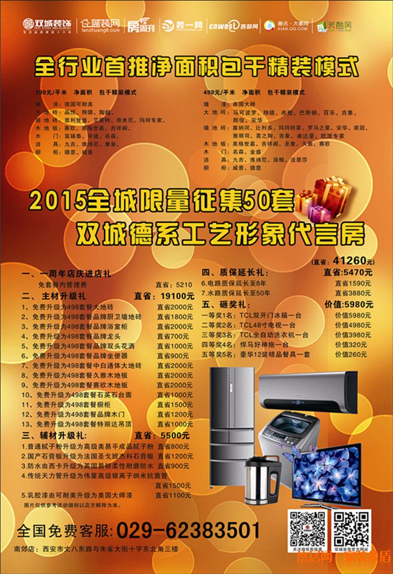 福利二、紅包墻,定裝修抽紅包,百分百中獎?。?br /> 福利三、幸運大轉盤,減免工程款,百分百中獎(轉轉盤抵工程款這種好事,不參加怎么對得起自己那即將裝修的房子!!?。?br /> 福利四、砸金蛋中家電,百分百中獎(冰箱、電視、洗衣機\(^o^)/~)