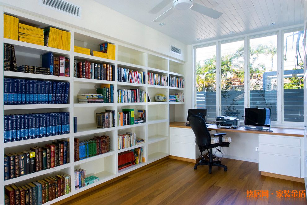 4、 頂天的貼墻書架充分利用了墻面的高度,木質材料營造出一種溫馨的氣氛。書架里的隔板在設計時可以自由組合,如果將其作為電視背景墻,需要提前為影音設備預留空間,如果放置些家居裝飾品,美觀之余,又巧妙的與實用功能相結合。