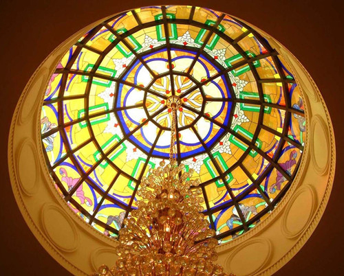 客廳天花板-彩繪玻璃,天花板材料中的彩繪玻璃,這種玻璃材質(zhì)的材料它的花色多樣,圖案多變。同時內(nèi)部還可以安裝照明設(shè)施,具有很好的透光性。但玻璃這種材料一般在天花板的小部分地方使用和局部的一些造型裝飾,彩繪玻璃的裝飾一般都會同輕鋼龍骨石膏板或膠合板共同來進(jìn)行裝飾。這樣會使整個天花板的造型更加的好看,更具有裝飾性。