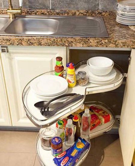 CASE4:轉角空間利用,櫥柜中的多層設計可以方便常用物品的收納,這樣的轉角層架,能很好地利用轉角空間,轉盤式設計也方便使用,L型、U型櫥柜都可以考慮有這樣的一個層架哦。