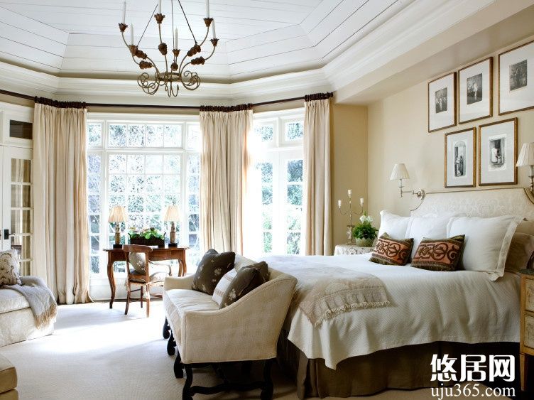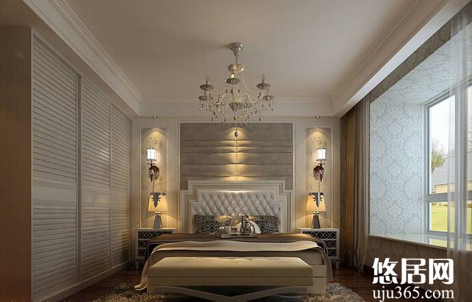 不同的裝飾品材質(zhì)都有著不同的質(zhì)感,即使是同一種色調(diào),也不會(huì)使得空間顯得單調(diào),反而會(huì)有意想不到的效果。白色皮質(zhì)背景墻、白色羽毛燈罩、白色羊絨地毯以及白色的棉質(zhì)床上用品,搭配起來(lái)能將空間拓展到極致,床頭的那種橫向線條能產(chǎn)生一種橫向的拉伸視覺(jué)效果,而兩旁的窗戶更是讓臥室有更多的自然光線,房間的透亮能夠有效地起到延展空間的作用;家具、布藝色調(diào)協(xié)調(diào)統(tǒng)一,也使臥室的裝修裝飾效果渾然一體,不顯雜亂。