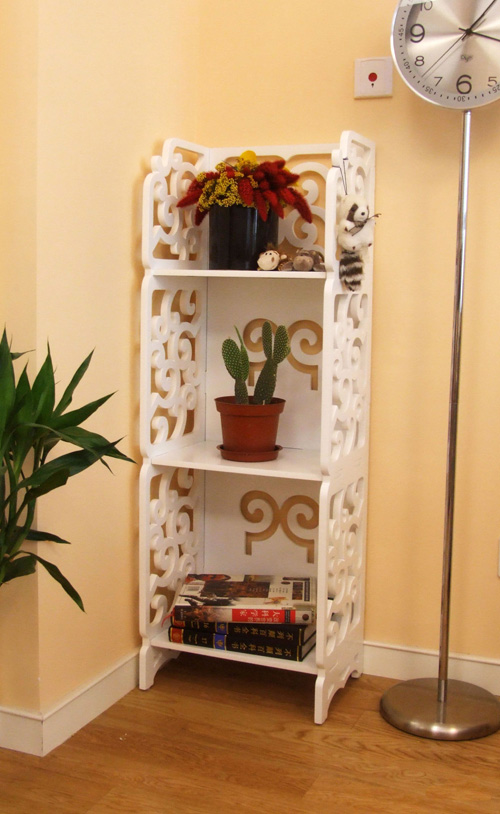 4、加一個拐角置物架,拐角置物架在《愛情公寓》中曾經出現過,放置在電視柜旁邊,可以放置電視遙控器、影碟、充電器、綠植等。這種置物架不用特地選擇與裝修風格一致,一個幾十塊錢的簡單的藤制置物架就可以了,非常百搭,也不會突兀。