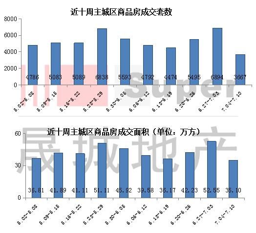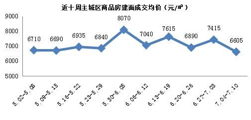 據(jù)晟城地產(chǎn)市場研究部數(shù)據(jù)統(tǒng)計(jì),從2016。7。04截止到2016。7。10,主城區(qū)商品房共成交3667套,成交套數(shù)環(huán)比下降46。8%,成交面積為35。10萬方,環(huán)比下降33。2%。從整體成交均價(jià)來看,上周建面成交均價(jià)約為6605元/㎡,環(huán)比下降10。9%。年中考核后,樓市進(jìn)入傳統(tǒng)淡季,各物業(yè)成交大幅下降,拉低成交價(jià)格。
