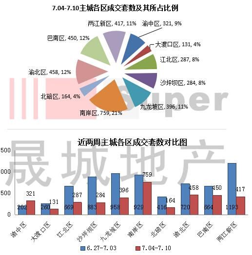區(qū)域一周成交體量(7。04—7。10)—南岸區(qū)排名第一,渝北區(qū)排名第二從以上數(shù)據(jù)表可以看到,在7。04-7。10日期間,重慶主城各區(qū)監(jiān)控?cái)?shù)據(jù)整體變化幅度較大。從各區(qū)來看,南岸區(qū)成交759套,排名第一,環(huán)比下降18。3%;渝北區(qū)成交458套,環(huán)比下降36。4%,位于第二;巴南區(qū)成交450套,排名第三。