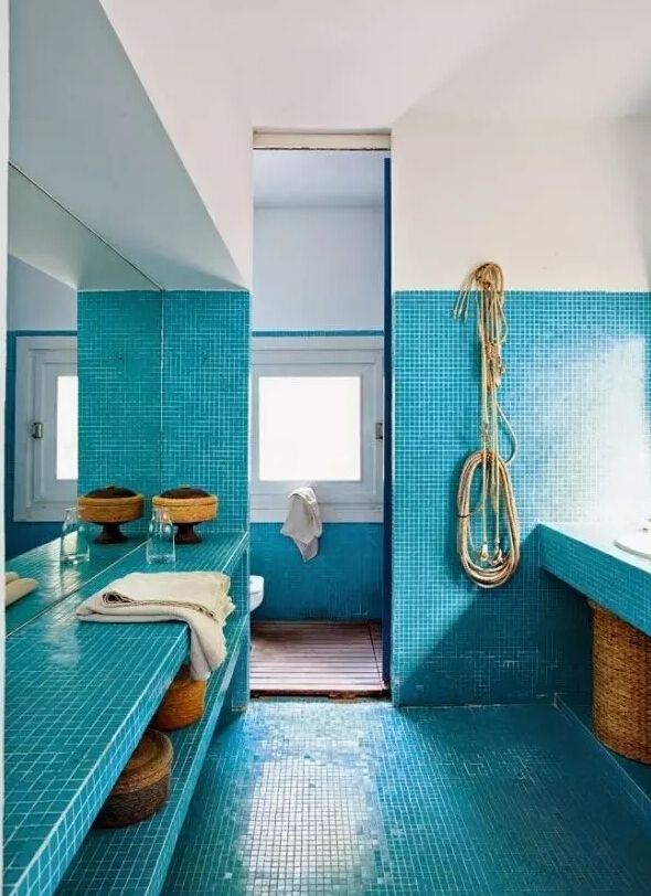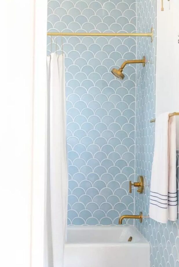 天藍色魚鱗紋磚更夢幻童真,在這種氛圍下或許更能激發想象力,洗個澡靈感涌現什么的。▼