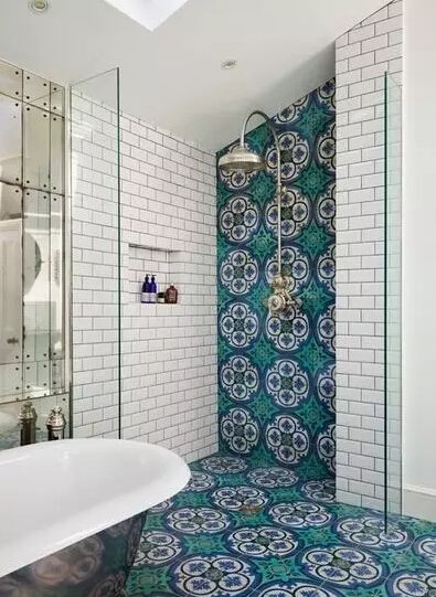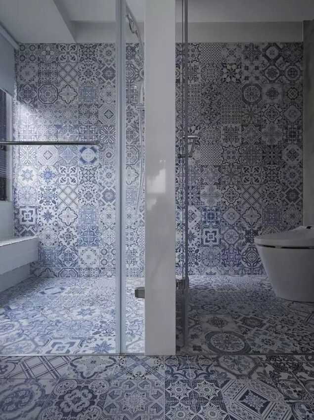 當然,花紋磚鋪滿墻面,也是美的。但是出于氛圍的考慮,還是推薦選擇顏色淡雅些的。▼.