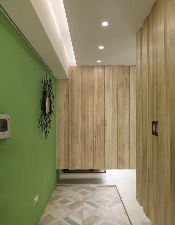 推開訂制大門,梧桐木架構起足量的鞋柜收納,而地坪上瓷磚選材低調定義了玄關界線。