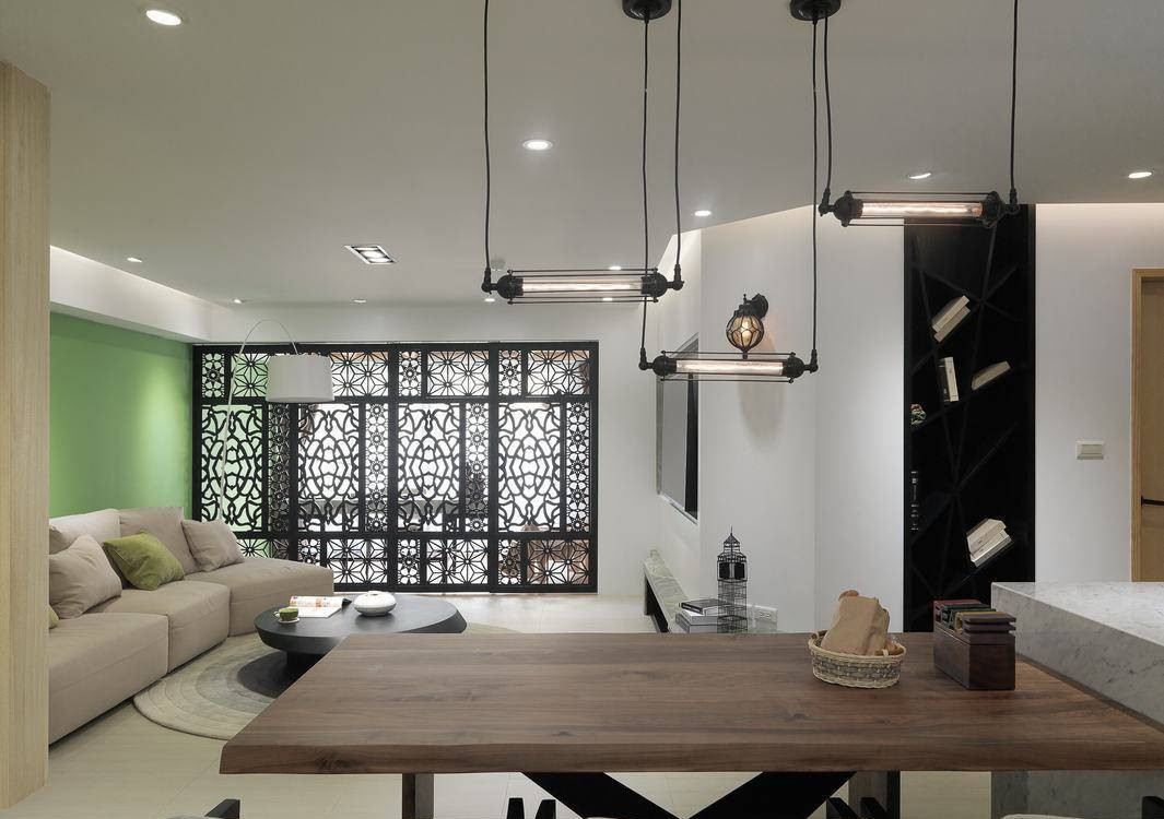 推開雕花拉門中介,采光清透入客廳公領域,大L型的收納柜體在視覺中由壁至天轉折出精彩層次。