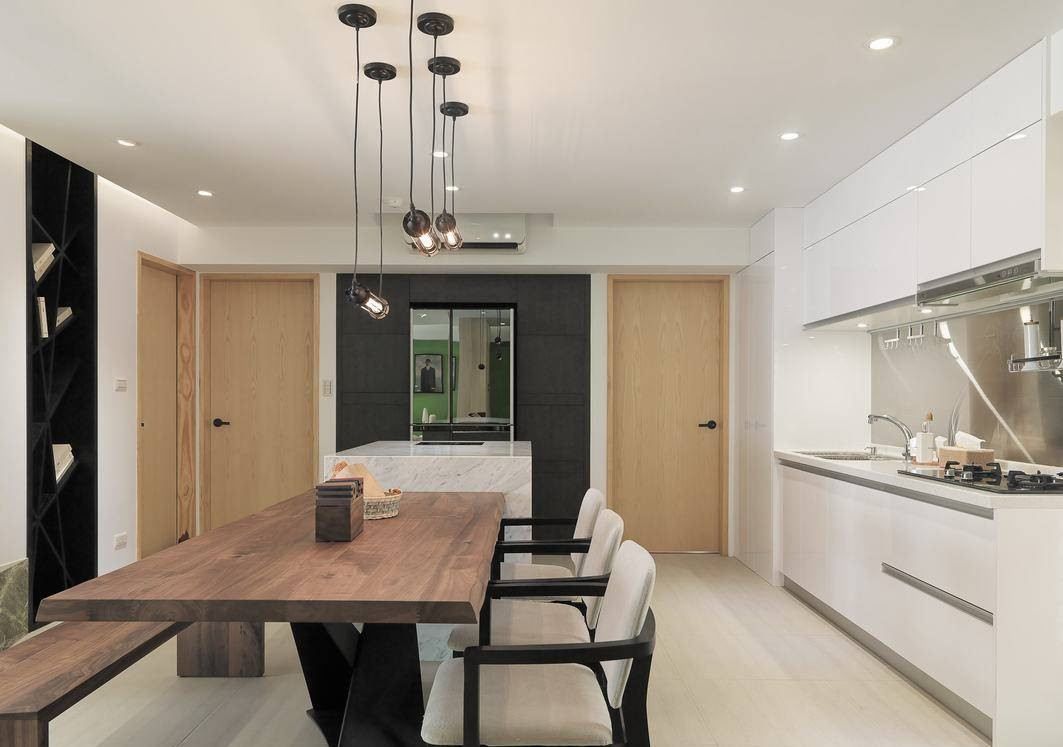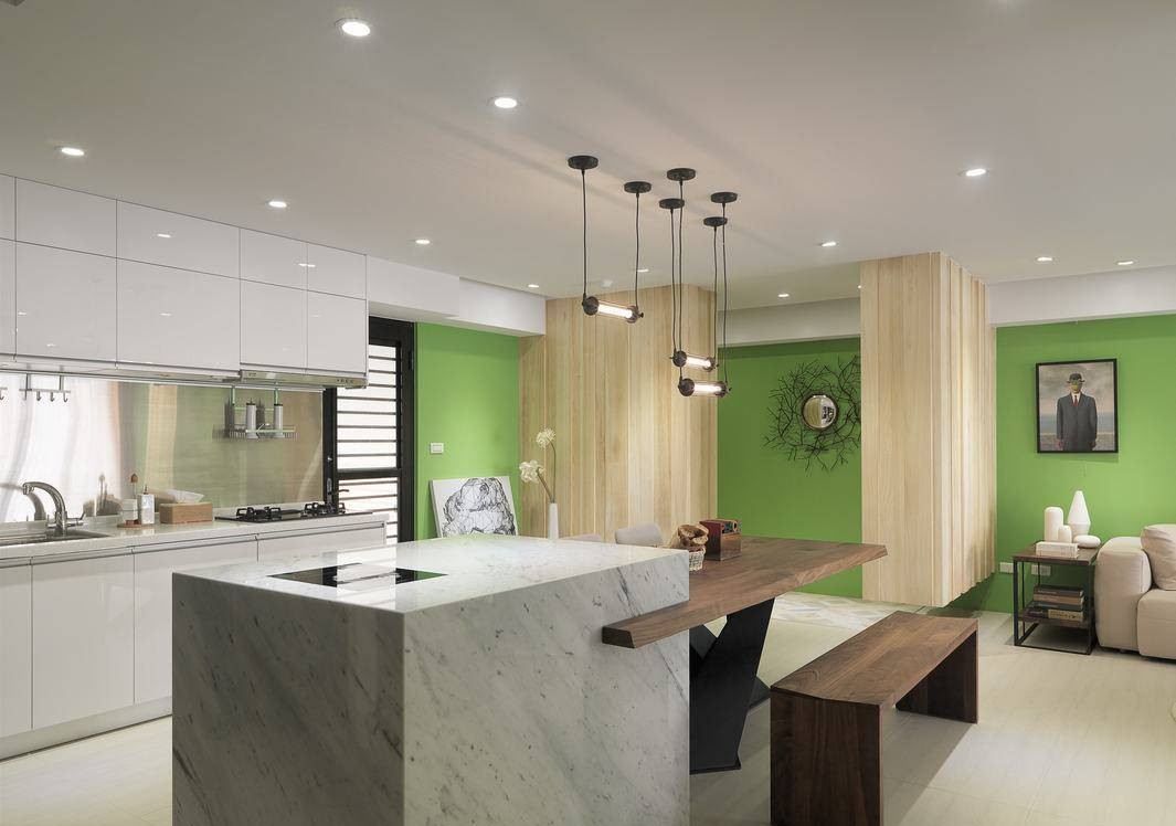 原木餐桌嵌上大理石吧臺,異材質的沖突結合上特殊桌腳設計,搶眼聚焦空間軸心。