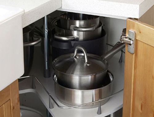 向大家推薦一個拐角收納的秘笈吧~囫圇吞棗收納法,實際上上部掛鍋子的地方是做了可活動的軌道處理,基本上保證了取用隨心,當然,死角內先前安裝了柜板挖空的哦!這種收納方式還不錯吧~