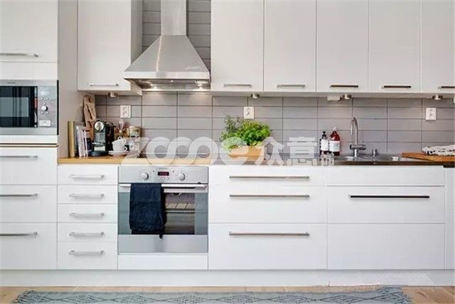 廚房的裝飾非常現代簡約,I 字型的白色整體櫥柜和整體相融合,讓狹長的廚房空間顯得井井有條,一應俱全。淺灰色方磚裝修的背景墻提升了空間質感,它光滑的磚面增加了廚房的亮度清理起來也很方便。