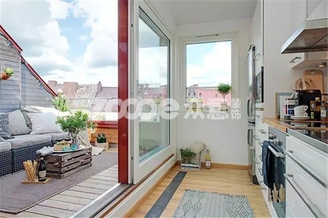 玻璃移門隔斷了廚房和室外休閑區,同時也從視覺上拓寬了廚房空間,陽臺的軟裝布置非常的雅致溫馨,家人朋友在這里可以聊天喝酒談心。