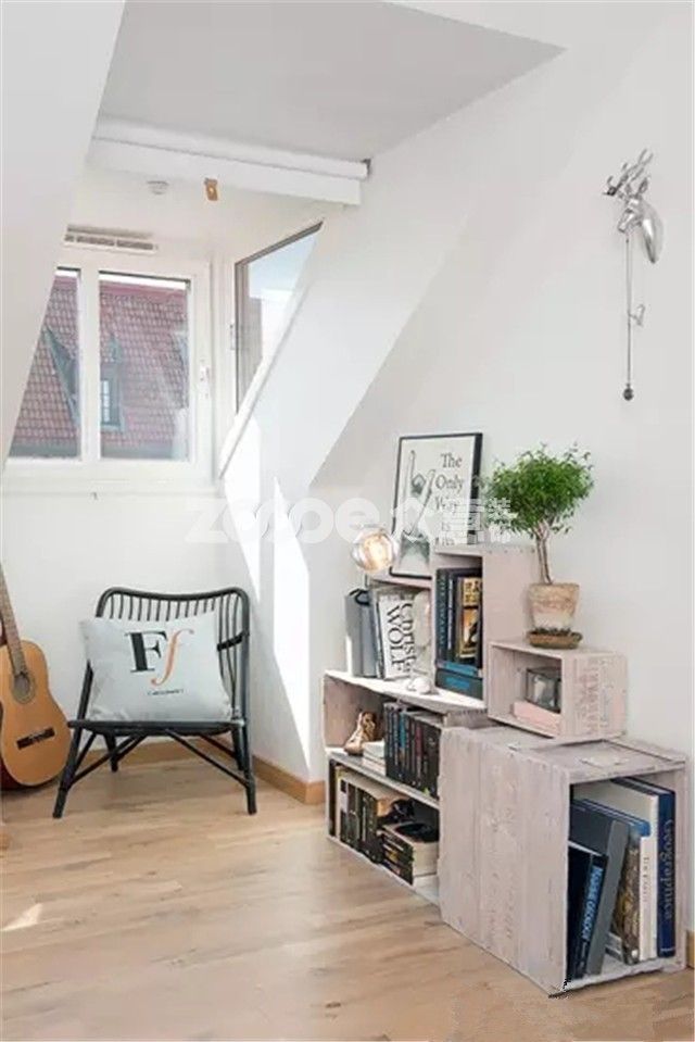設計師充分利用了空間的優勢,窗戶兩側的傾斜墻體讓小小的窗口空間顯得十分立體,同時因墻體的遮擋,采光相對變得更加集中,書房的亮度得以提升。