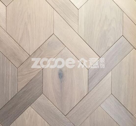 以六角形地板為中心想周圍擴散,六角形地板的六個邊利用地板來契合,這樣的地板鋪設方法更加考驗施工工藝。