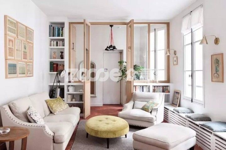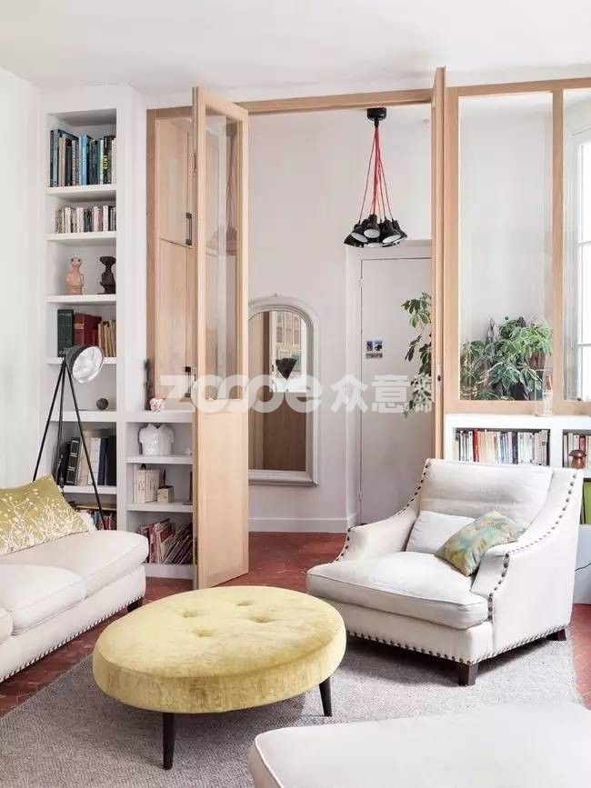 建筑還保留著原先的格局,設計師Camille Hermand 卻利用了更巧妙的方法將它分割,過道與客廳之間的隔墻被拆除了部分,重新利用定制的儲物架得到延伸,屋主的書籍、擺設都可以得到妥當的擺放,室內以純凈的白色調為基底,家具也采用線條圓滑、溫暖的米白色為主,營造出優雅柔和的基調。