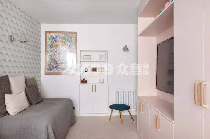 室內的布局如同迷宮般有趣,多處“隱藏”的門,讓功能區的尋找也充滿了樂趣,通過架高的木質樓梯,小巧的門框,便聯通到了臥室區,白色基底下粉色的定制衣柜與地毯互相呼應,灰色調的單人床、壁紙、裝飾畫,色彩豐富卻十分的柔和,更增加了甜蜜與夢幻感。