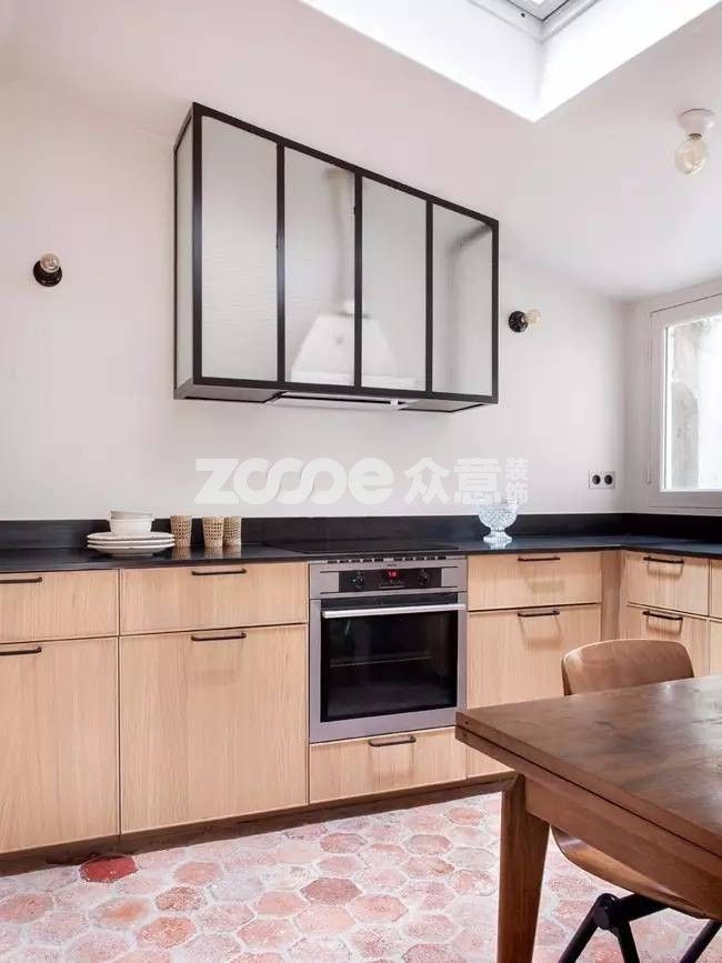 在廚房的天花上,設計師特意開設了天窗,讓光線可以從四處灑進室內,避免豐富的櫥柜以及黑色調大理石帶來的壓抑感。
