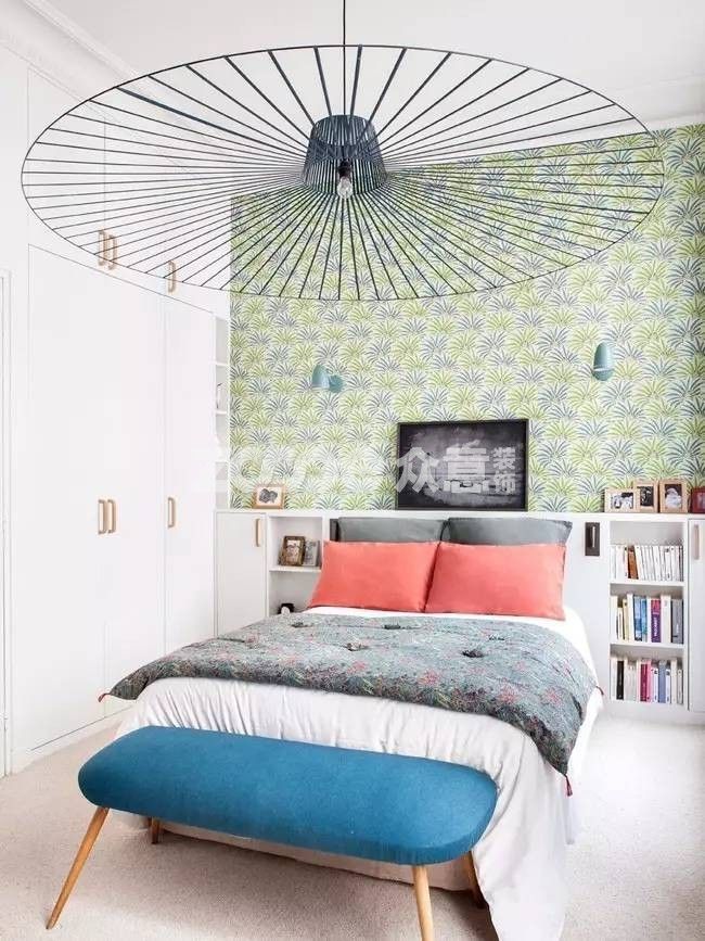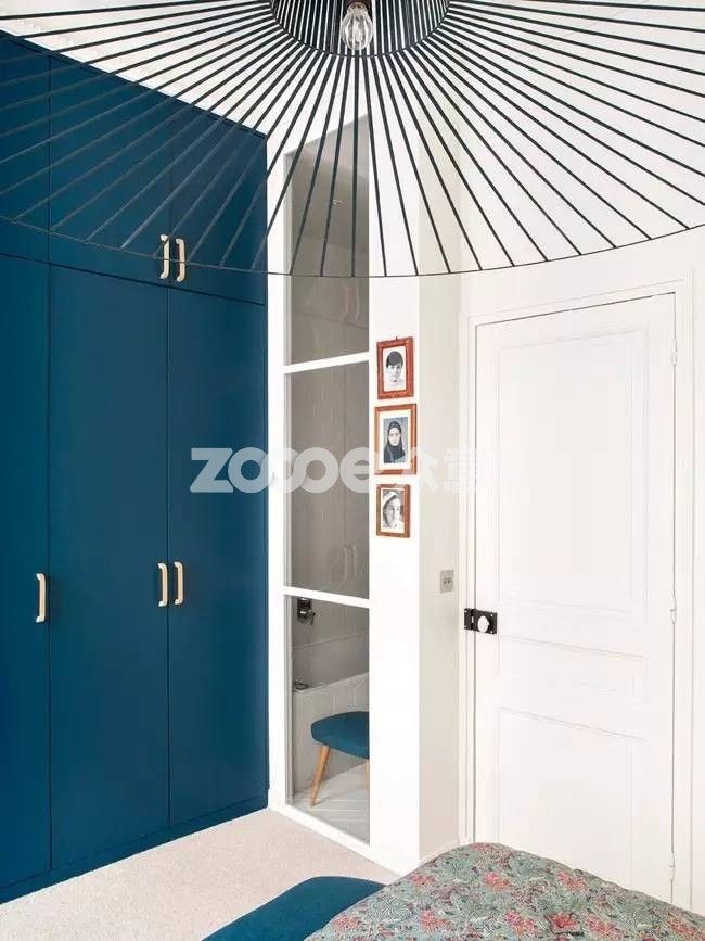 另一間臥室利用定制的柜體讓室內擁有豐富的儲物空間,所有東西都收納妥當,帶來潔凈清爽的視覺效果,夸張的吊燈、紅色的點綴,藍色調的延伸從臥室至洗浴室,素雅的空間也擁有多處視覺焦點。
