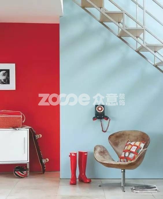 ▲可以搭配出非常美的撞色效果。撞色不能用純度都高的顏色去撞,那樣總給人一種兩敗俱傷的感覺,沖擊力是夠了但并不賞心悅目。你看,紅色是完全鮮艷的,但是藍色用得很輕。清新柔和的水藍色一出現,立刻就把用色艷俗的高風險給降了下來,整個空間平衡得恰到好處。