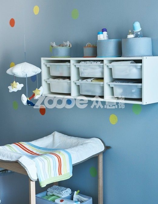有了儲物件,在深夜為孩子換尿布時,不僅省去了到處翻找的麻煩,還能節省時間。垃圾桶和籃子掛在嬰兒換衣桌上方的墻壁上,孩子無法夠到,但你卻觸手可及。之后,你就可以將儲物件調節到地板高度,方便孩子取拿他們的玩具!