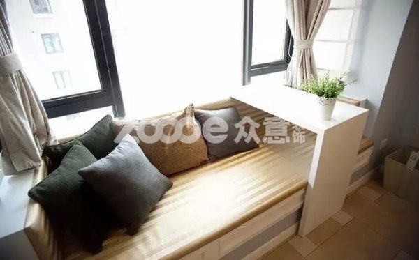 把飄窗設計成卡座,不要擺桌椅,直接在旁邊地面上鋪一塊地毯或是軟墊,卡座里存放上玩具或書籍,孩子可以坐在地上玩游戲,大人在旁邊的飄窗上看書。