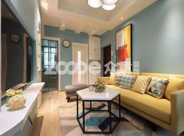 改造后,由于受到業主的制約,不能改動門的高度和尺寸,設計師選擇用白色的基色來弱化這種效果,讓空間的豐富色彩來平衡硬件的不足。完全內嵌電視的保留,在原本不寬裕的客廳空間上,很好的得以最大化利用。