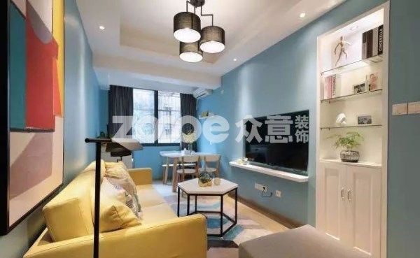利用電箱位子的偏移,我們搭配了長方形的裝飾畫,無規則豎置,很好的隱藏了電箱,讓空間美而有趣。明黃色布藝沙發,搭配淺藍色墻面,互補色的視覺沖擊,讓整個起居室充滿陽光感。