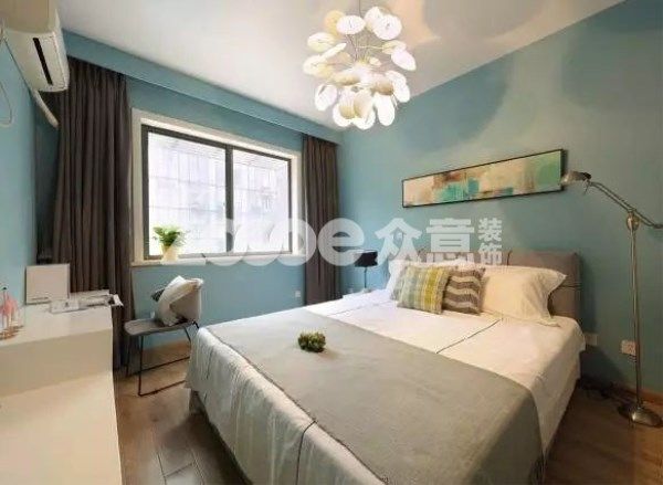 藍白色系搭配,灰色床品。與客廳區域整個空間相呼應,營造簡約舒適的氛圍。