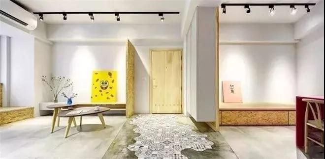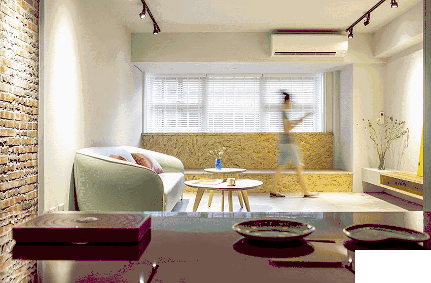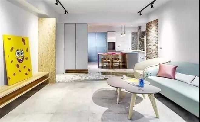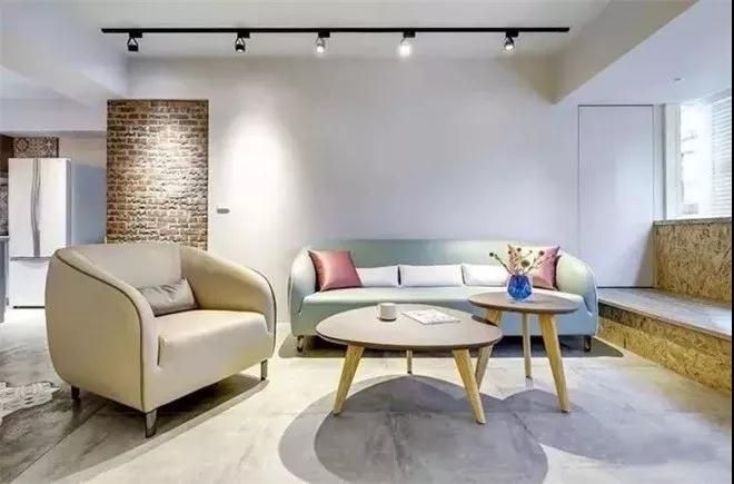 空間設計相當簡潔,大白墻,低飽和色系沙發,有種軟糯的感覺,適合小女生。