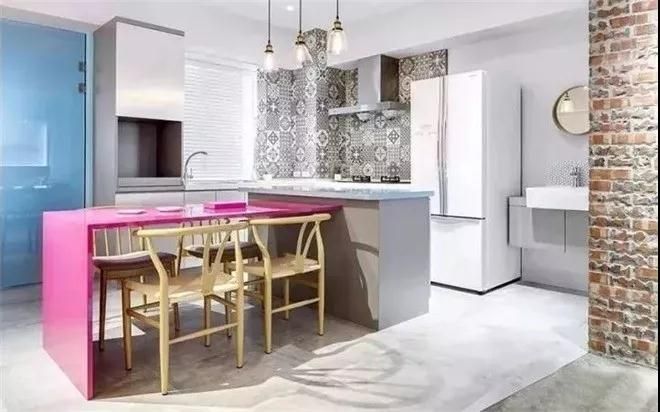 玫紅色水晶板中島餐桌,與料理臺呈T型連接,在用餐的同時也能很好的與家人朋友互動,一個色調活潑,功能實用的餐廳。