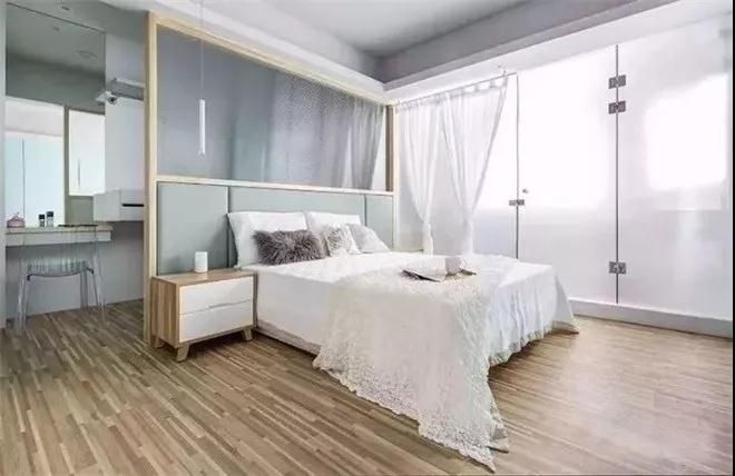 主臥整體以淺湖綠與純白為基調,局部加入木色堆疊出輕柔的氛圍,采用壓花玻璃床頭半作隔斷設計出一處衣帽間,再用毛玻璃設計功能隔間,營造視線通透的舒眠環境。