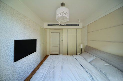臥室燈光不宜太亮,否則會影響睡眠質量,朦朧的燈罩增加了幾分朦朧的美感,周遭的燈可以增加屋內亮度但是又不會直接照射眼睛,床體,地毯,墻壁顏色協調一致,無論是與親愛的ta一起躺在床上看電視,還是欣賞窗外的美景,都會是很好的享受吧。