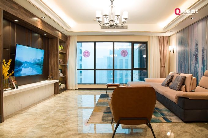 客廳做為主要活動區域,色彩搭配以暖色為宜,以線條簡潔流暢,柔和大方。如果電視背景墻面積較大,大氣型的背景墻應該避免的是單調,可以用兩到三種不同材料來打造,比如大理石、玻璃、實木貼面、壁布等,另外,墻面造型上可以略有層次感,寥寥幾筆的勾勒就能讓這面墻生動起來。