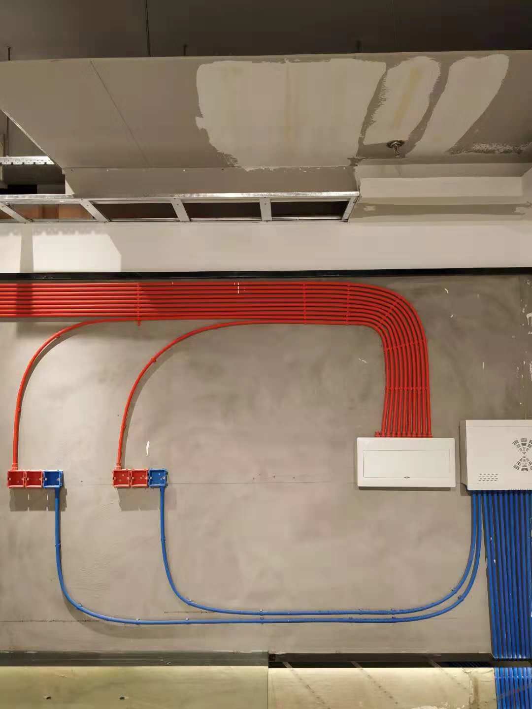電路規(guī)劃過程中,紅色線管為強電線管走天,藍色線管為弱電線管走地,排列講究大灣工藝,這樣做既美觀也有效避免強弱電干擾,也方便后期對電線的定位