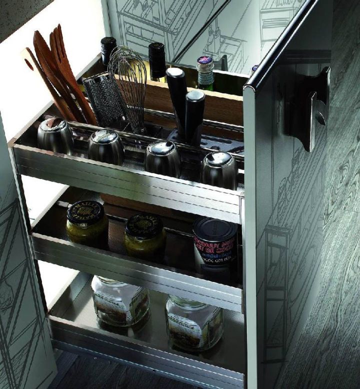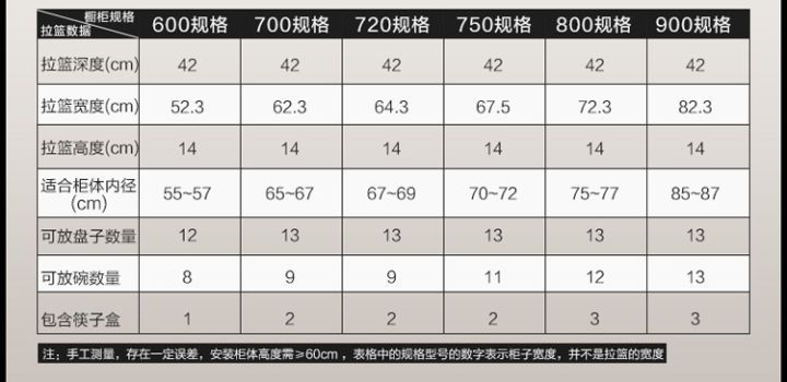 配件規劃 拉籃和碗籃都是提高廚房利用率的利器。 安裝調味籃預留位置,可以參考下面尺寸。