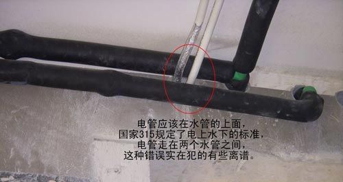 水電管交叉時怎么處理? 如果水管在上,當出現冷凝水,可能使電線受潮,出現短路、跳閘的情況(雖然概率非常低),所以建議水管在下。 走天的水電可以直接分層走線,電在上。 走地可以切開水管,安裝一個過橋彎繞下方,將電線靠在水管的上方。