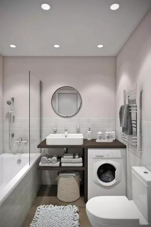 洗漱臺下預留洗衣機的位置,不僅節約空間,也讓衛生間顯得非常整齊。洗衣機在洗漱臺下,將水注入洗衣機中,也非常方便。