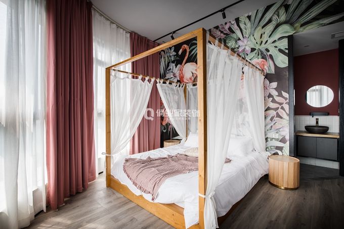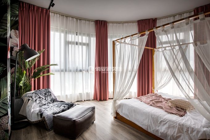 3、臥室套房1裝修:房間全落地窗環繞,是這個房間的最大優勢,視野開闊無遮擋。Ins風綠植墻紙,圖案簡單卻帶有治愈性,搭配臟粉大窗簾,讓空間充滿生機,連陽光也變得活潑,幸福感滿滿爆棚!