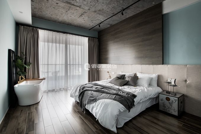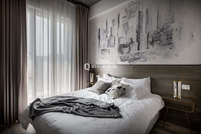 4、臥室套房2裝修:溫潤質樸的風格同樣打動人心,床頭背景選擇有“山城”之意的水墨畫壁紙,精致時尚的床頭燈、平滑木料的床頭,以及輕盈布藝窗簾…… 質感不同的元素在這里演繹出內斂輕松的氛圍感。