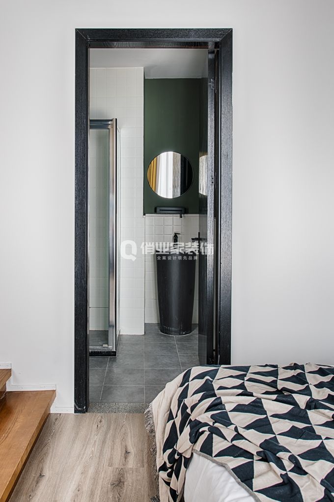 5、臥室套房3裝修:湖綠色的乳膠漆背景墻+木色飾面板,時尚與復古相結合,床頭的軟包讓舒適性直線上升,放下奔走一天的疲憊。造就當代快節奏生活里的一點小愜意。
