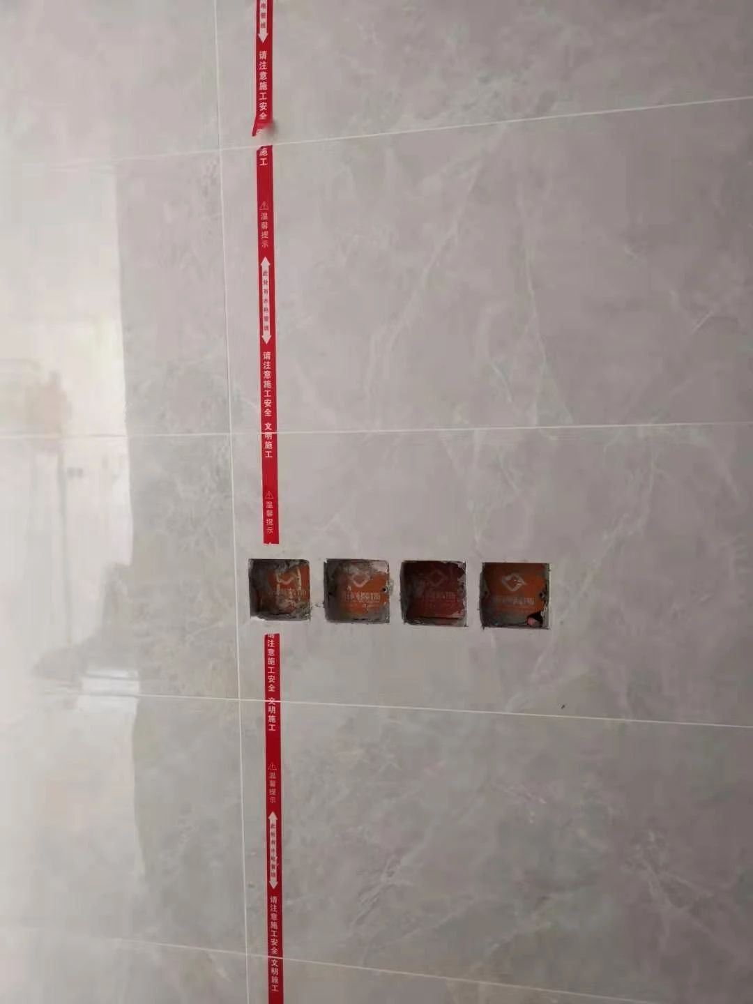 磚鋪貼完工后,粘貼醒目的水電標識帶,線盒保持在同一水平。插座預留條合格。