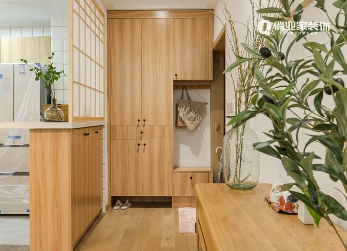 一進門,就發現玄關的設計實用而極具心思。實用性的換鞋凳、大收納功能的鞋柜。同時,木質材料搭配半透明的樟子紙,以經典的日式推拉門款式做隔斷,朦朧的通透感符合日式MUJI風,簡練之余多了些自然的韻味。