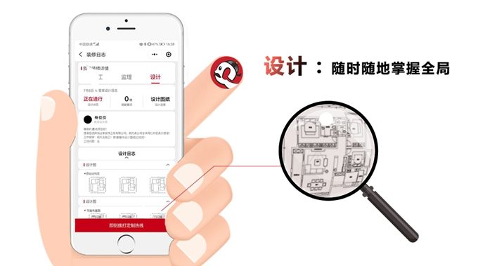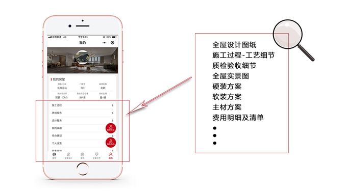 3. 設(shè)計服務(wù),全面貫穿式跟進——設(shè)計師全程服務(wù),全屋資料云端存儲。上傳房屋所有設(shè)計圖紙和方案明細到業(yè)主后臺,業(yè)主可以隨時隨地、更方便快捷的調(diào)用房屋的各項數(shù)據(jù)信息!