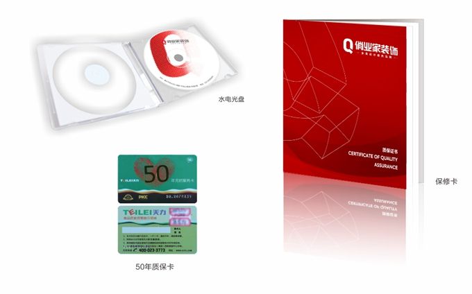 憑質(zhì)保卡享受隱蔽工程5年,表面工程2年的質(zhì)量保修,享受輔材品牌“天力”水管50年黃金質(zhì)保,水電光盤、50年質(zhì)保卡、保修卡等一應(yīng)俱全。