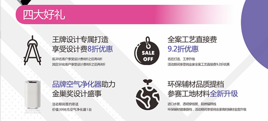 參與本次活動前20名業主享受設計費8折之后再6折,其后50名客戶享受設計費8折之后再8折;全案工藝直接費9.2折優惠,名匠打造、工序升級;簽約即送價值3680元空氣凈化器1臺;環保輔材品質提檔,參賽工地材料全新升級進口水管、透明穿線管、阻燃輻照線…環保輔材健康提檔,活動期間享受俏業家高檔輔材全面免費升級!