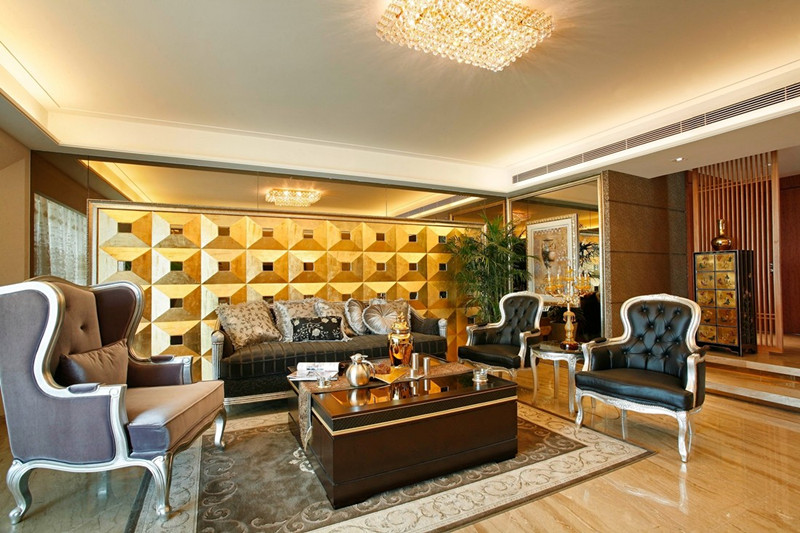 客廳的空間大,適合用金屬色做背景,金色最好不過。茶幾也很大氣,給人一種踏實的感覺。一個家植物不可少,但也不宜過多,起到點綴的效果。